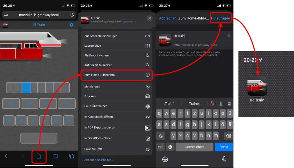 Für iOS gibt es die IR Train App im Apple AppStore. Die App sucht erst im lokalen Netzwerk nach dem IR Gateway und sollte dieses nicht gefunden werden, wird versucht eine Verbindung mit dem WLAN Maerklin292xxGateway aufzubauen.